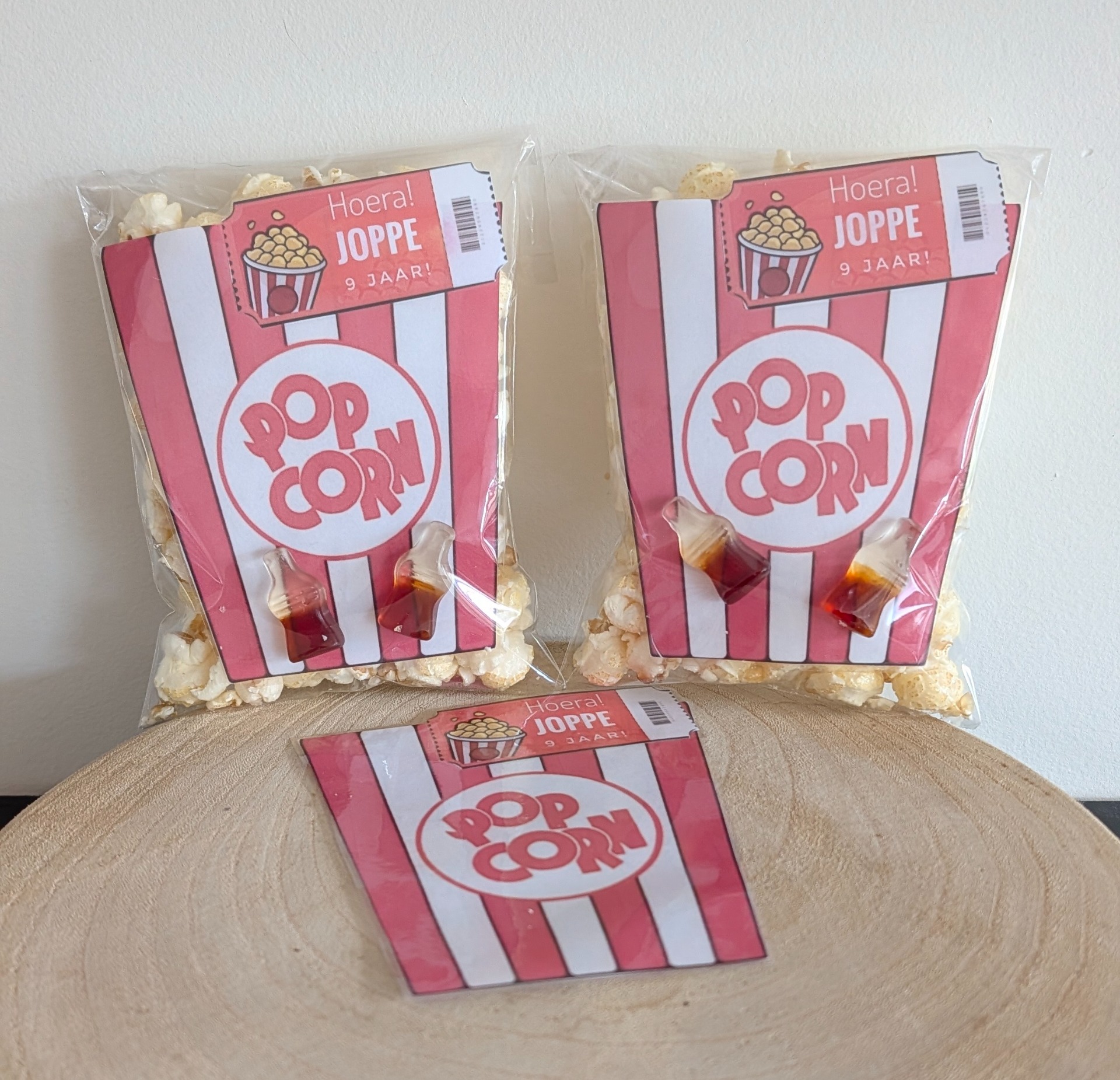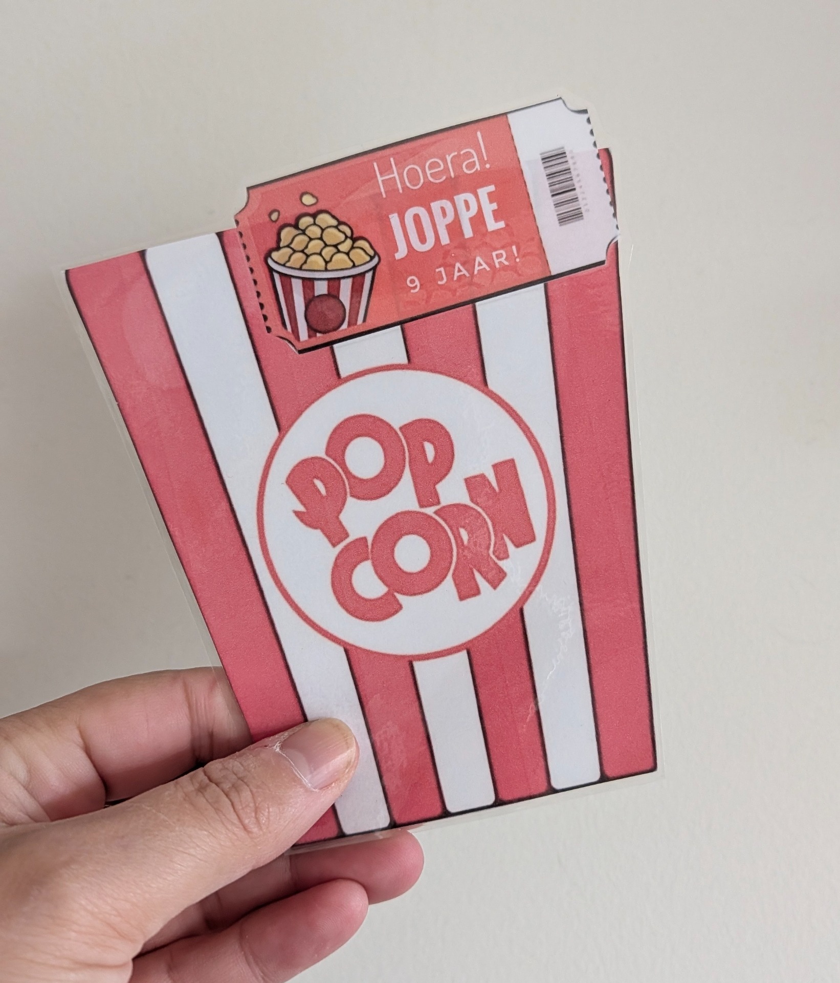 Leuke bioscoop popcorn traktatie. De kaart is gelamineerd met bioscoop kaartje waar de naam en leeftijd van de jarige op staan.