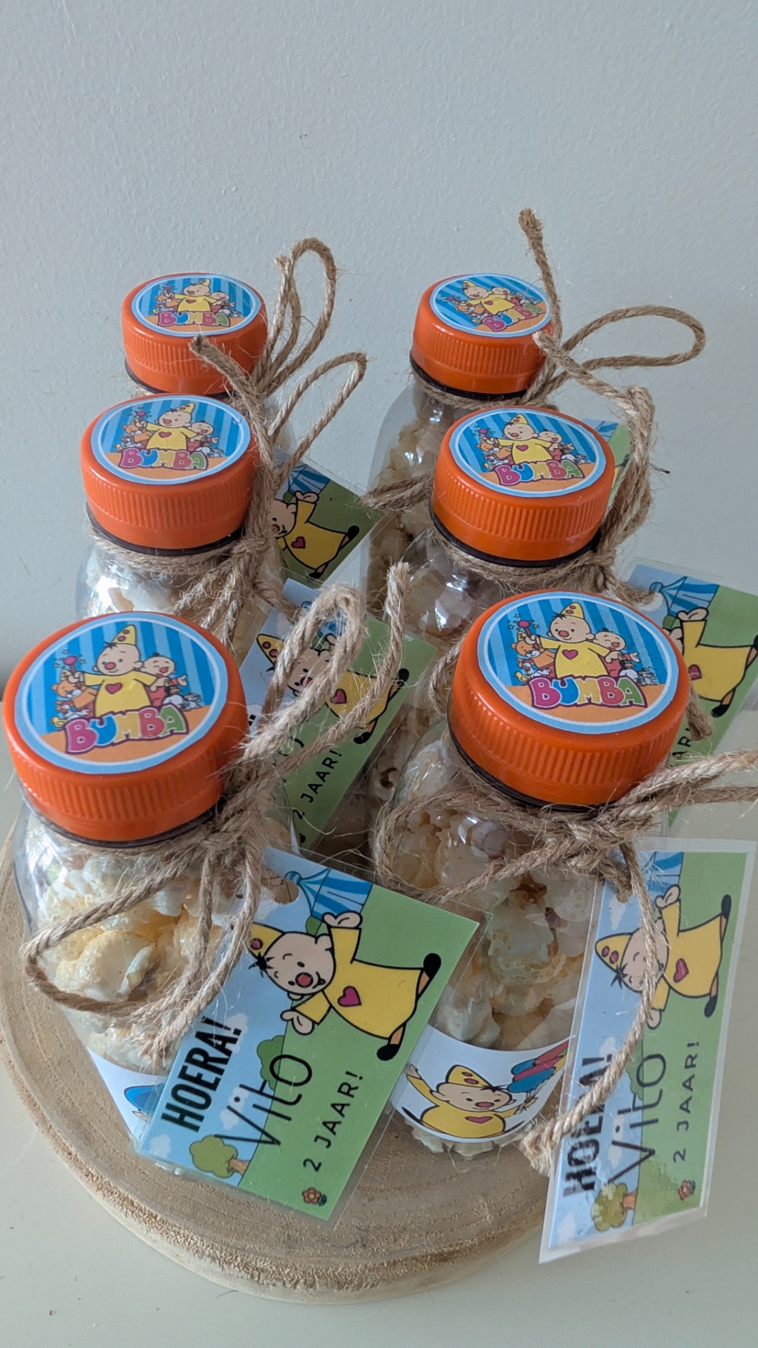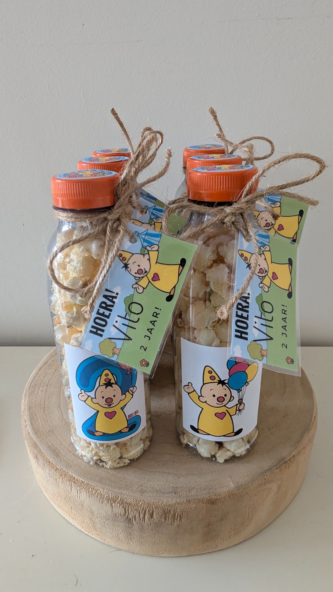 Heb je zelf geen tijd of inspiratie om een traktatie te maken? Bestel dan deze leuke Bumba petflesjes gevuld met zoete popcorn. Er zijn verschillende etiketten, bovenop de dop een leuk Bumba afbeelding