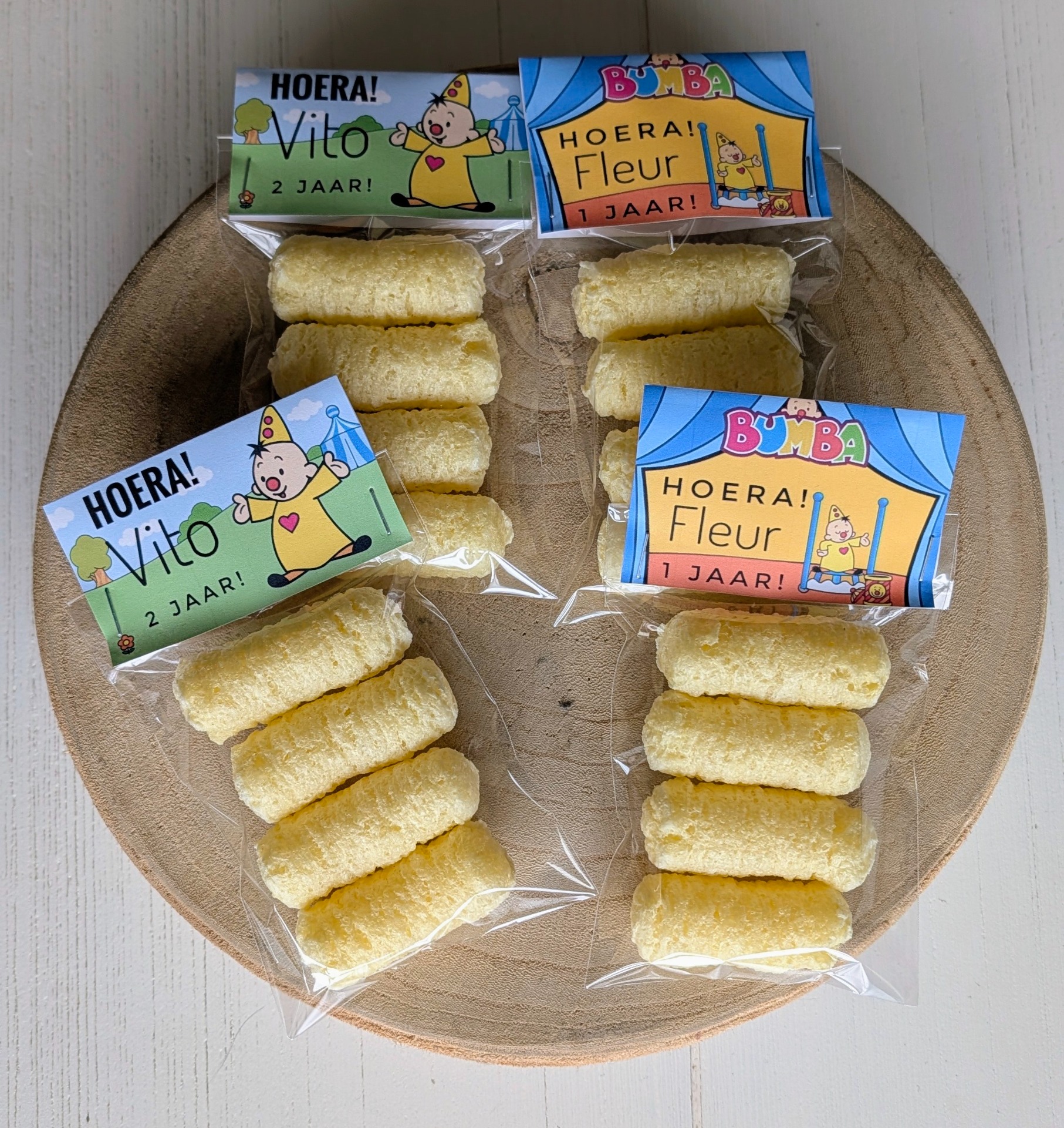 Heb je zelf geen inspiratie of tijd om een traktatie te maken? Deze traktatie bevat vier mais fingers (zie afbeelding 3) en het label is gepersonaliseerd met naam en leeftijd van de jarige. Kies welk label je wilt en de naam en leeftijd kun je doorgeven aan het rind van de bestelling bij extra informatie.