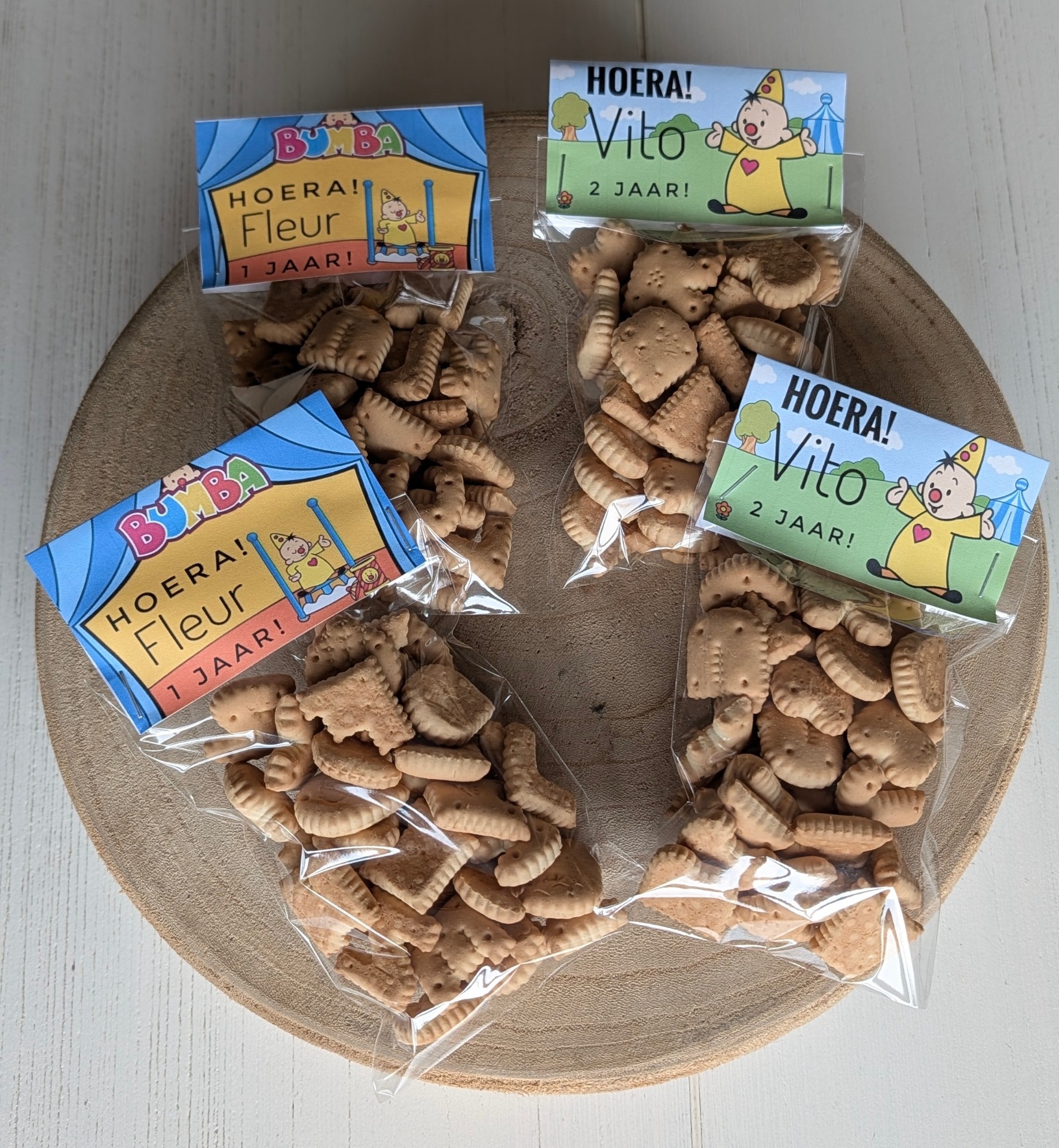 Heb je zelf geen inspiratie of tijd om een traktatie te maken? Deze Bumba traktatie bevat alfabet koekjes en het label is gepersonaliseerd met naam en leeftijd van de jarige. Kies welk label je wilt en de naam en leeftijd kun je doorgeven aan het rind van de bestelling bij extra informatie.