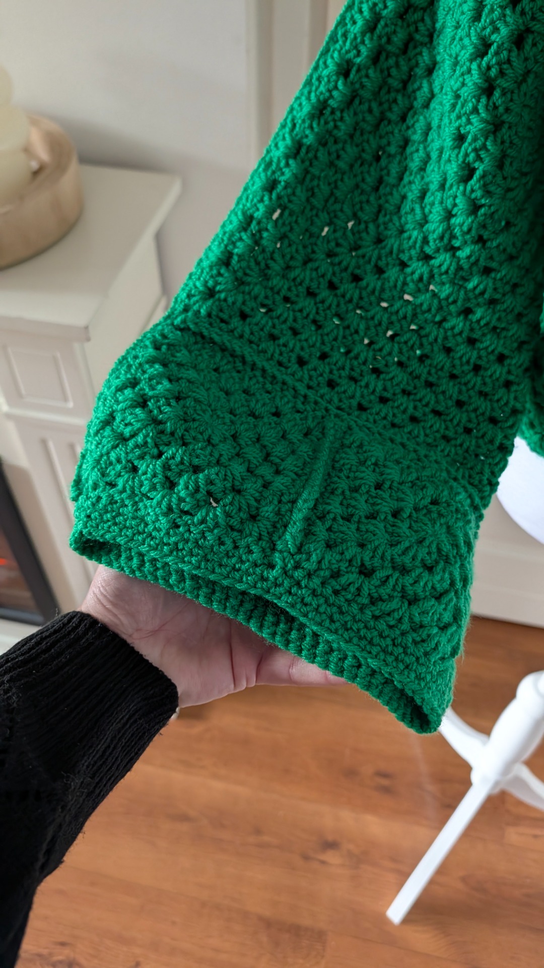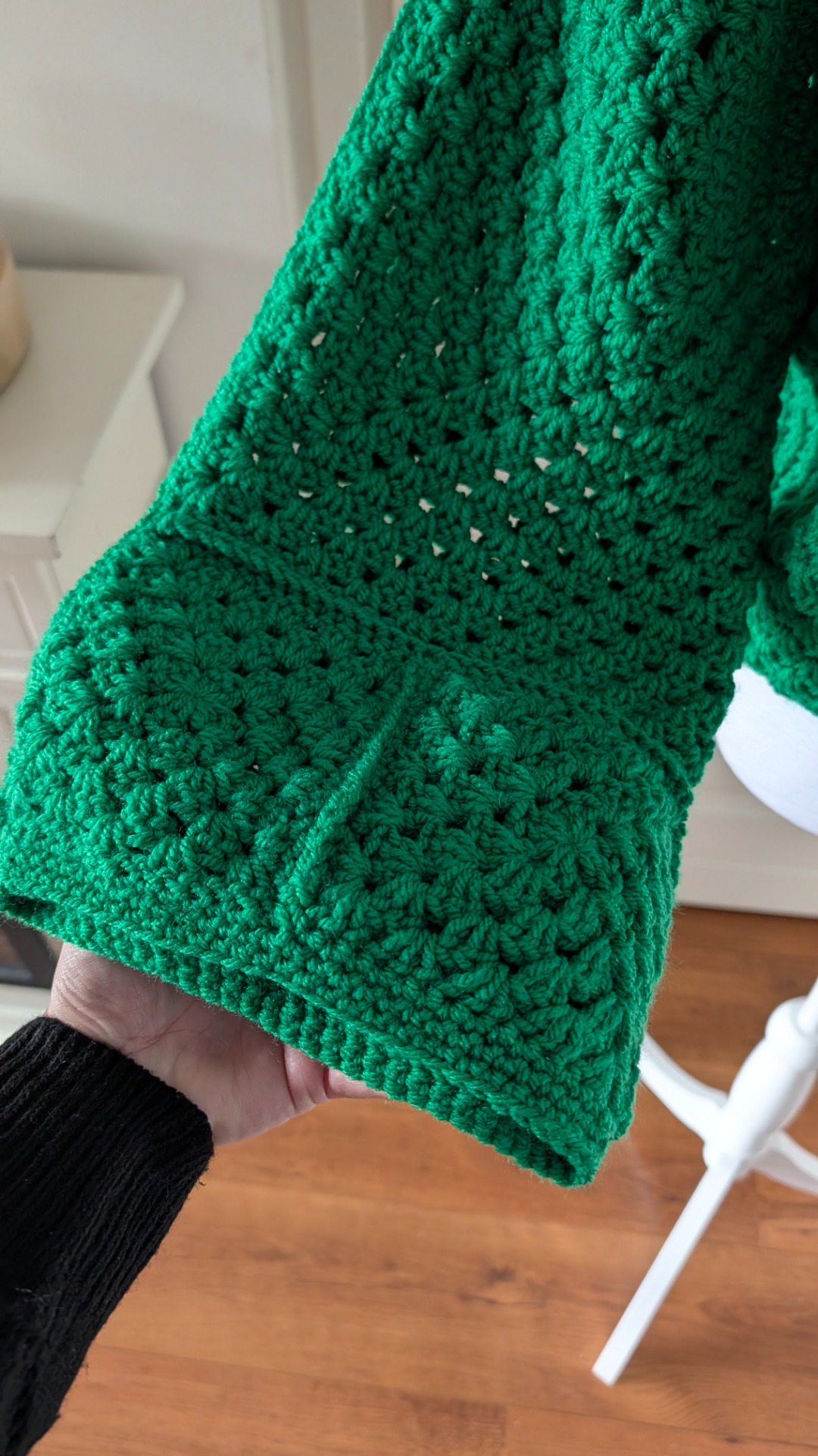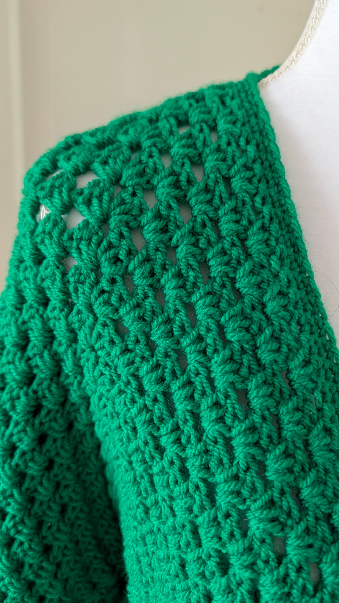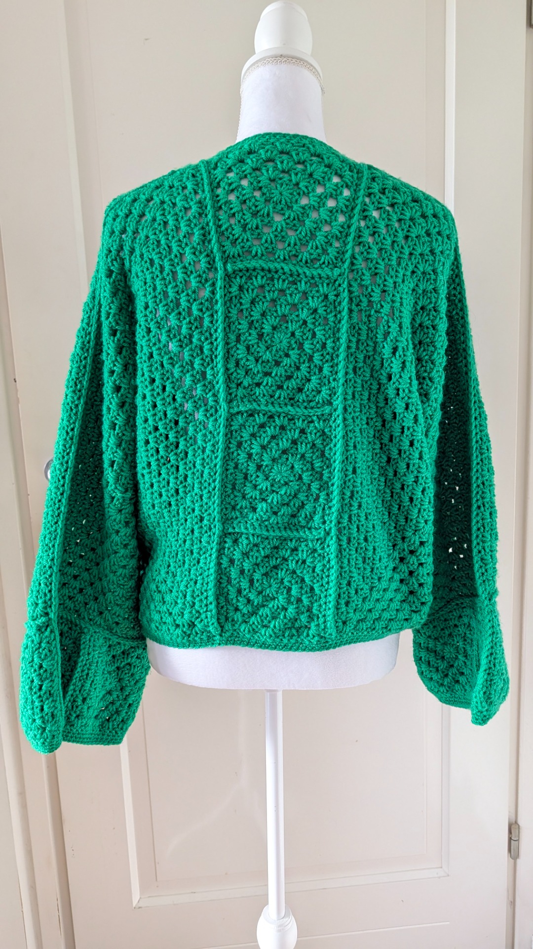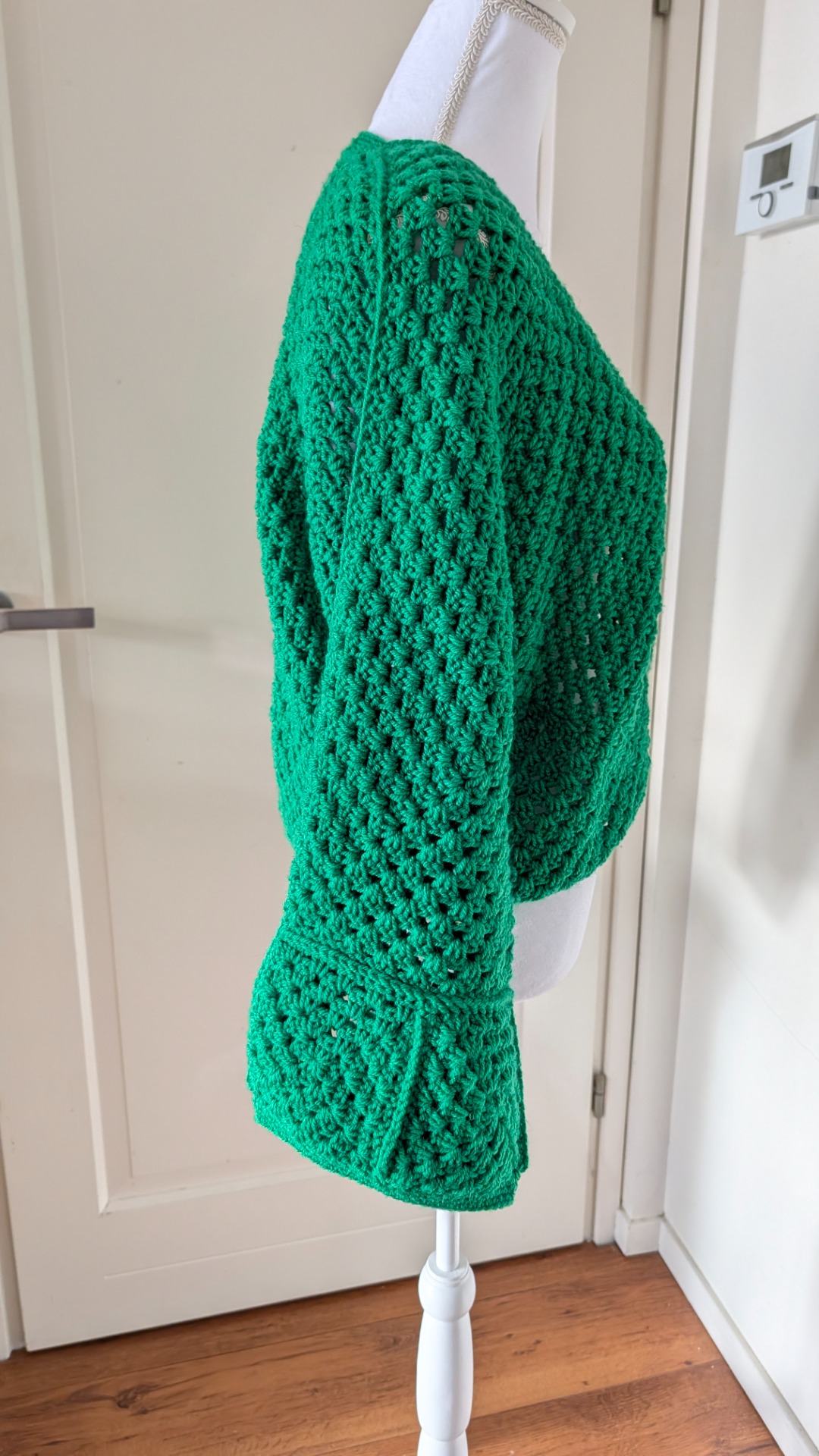 Dit gehaakte appelgroene vest heeft aparte wijde mouwen en op de rug een leuk patroon.