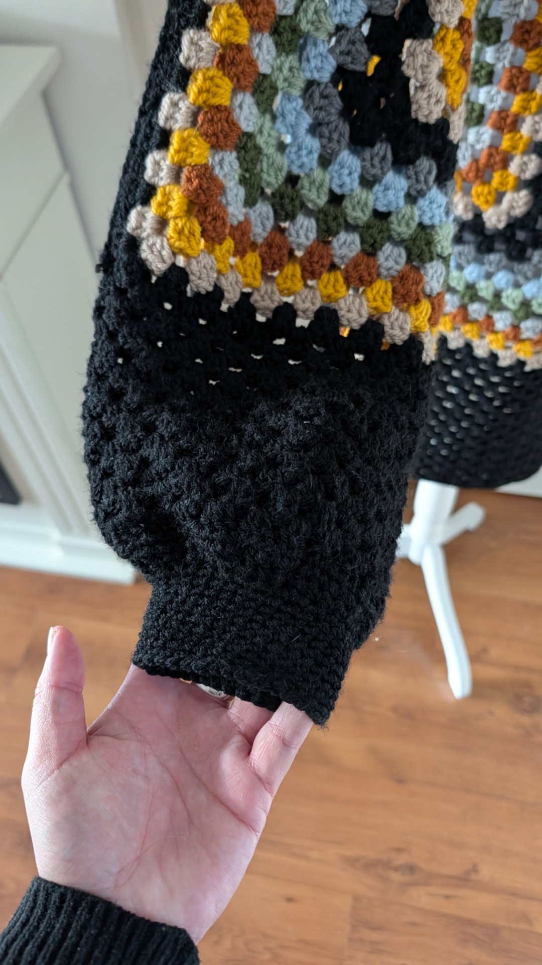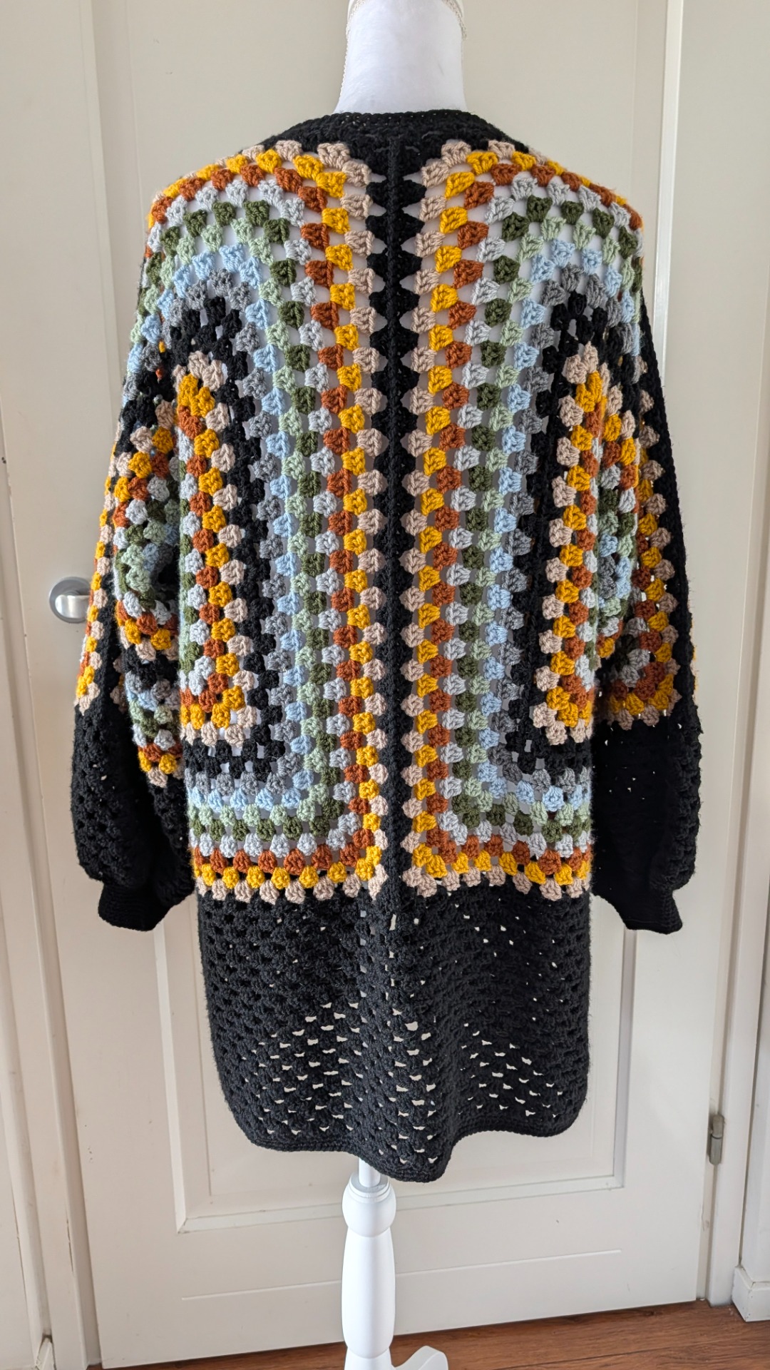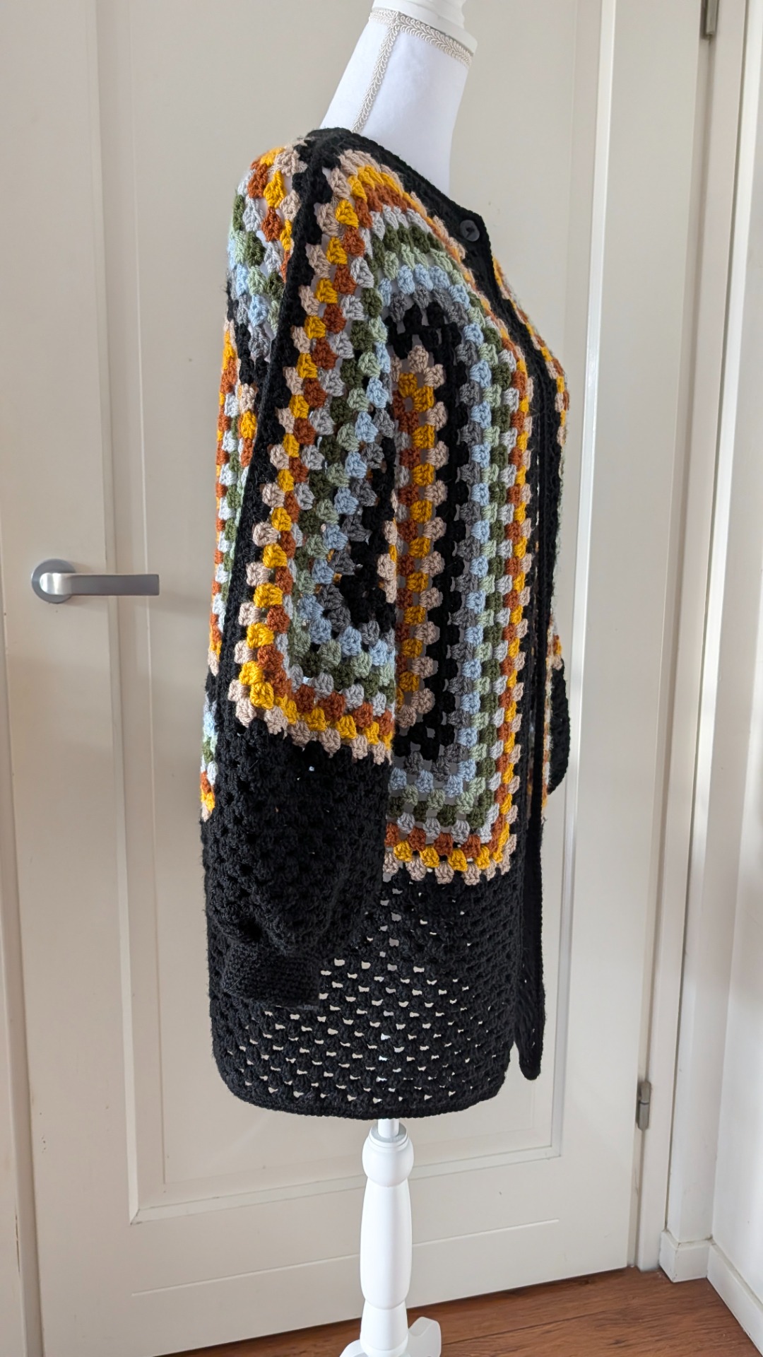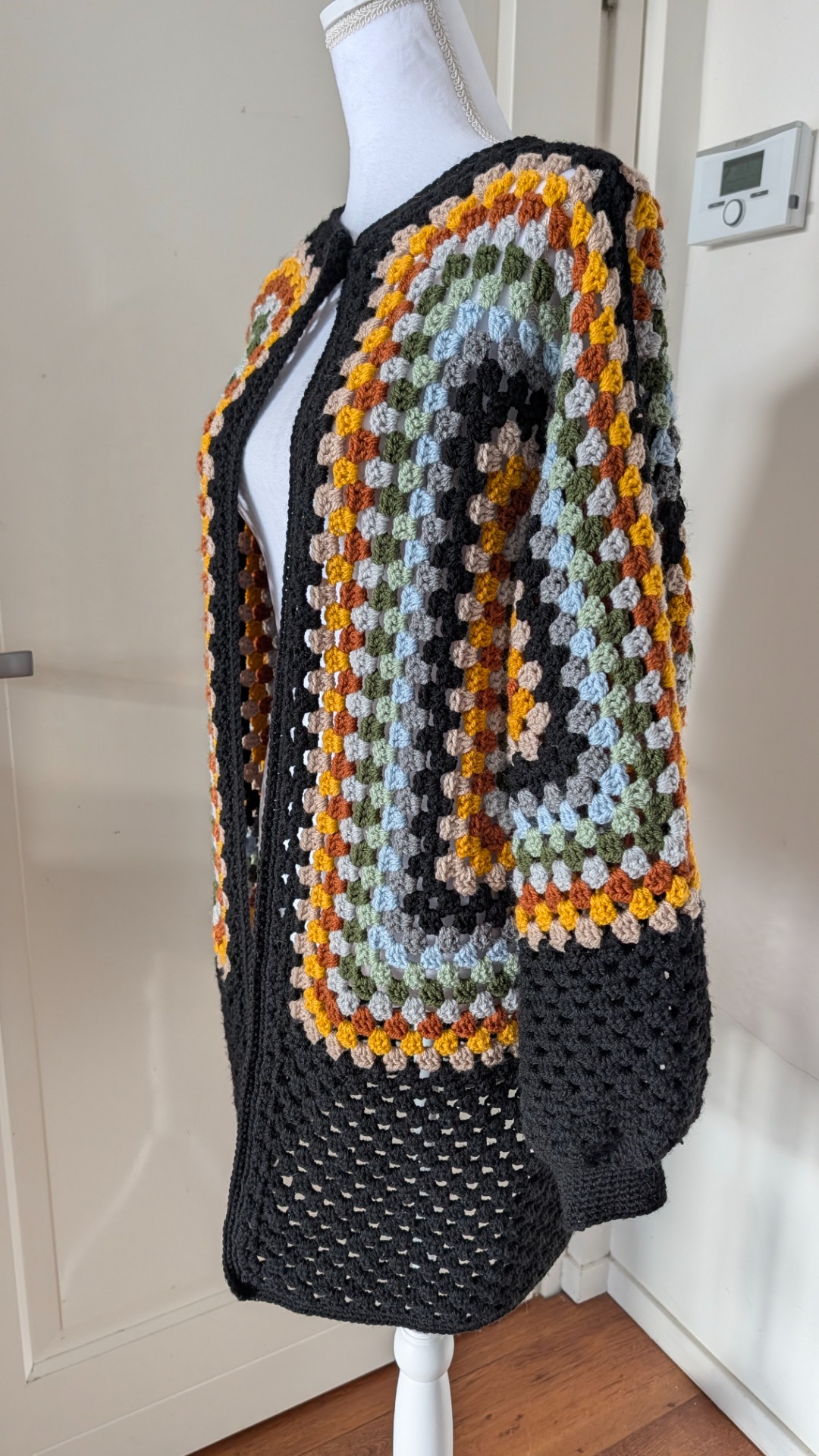 Dit mooie half lange vest valt tot halverwege de bovenbeen. Er zit een knoopje bij de hals en de mouwen hebben boorden