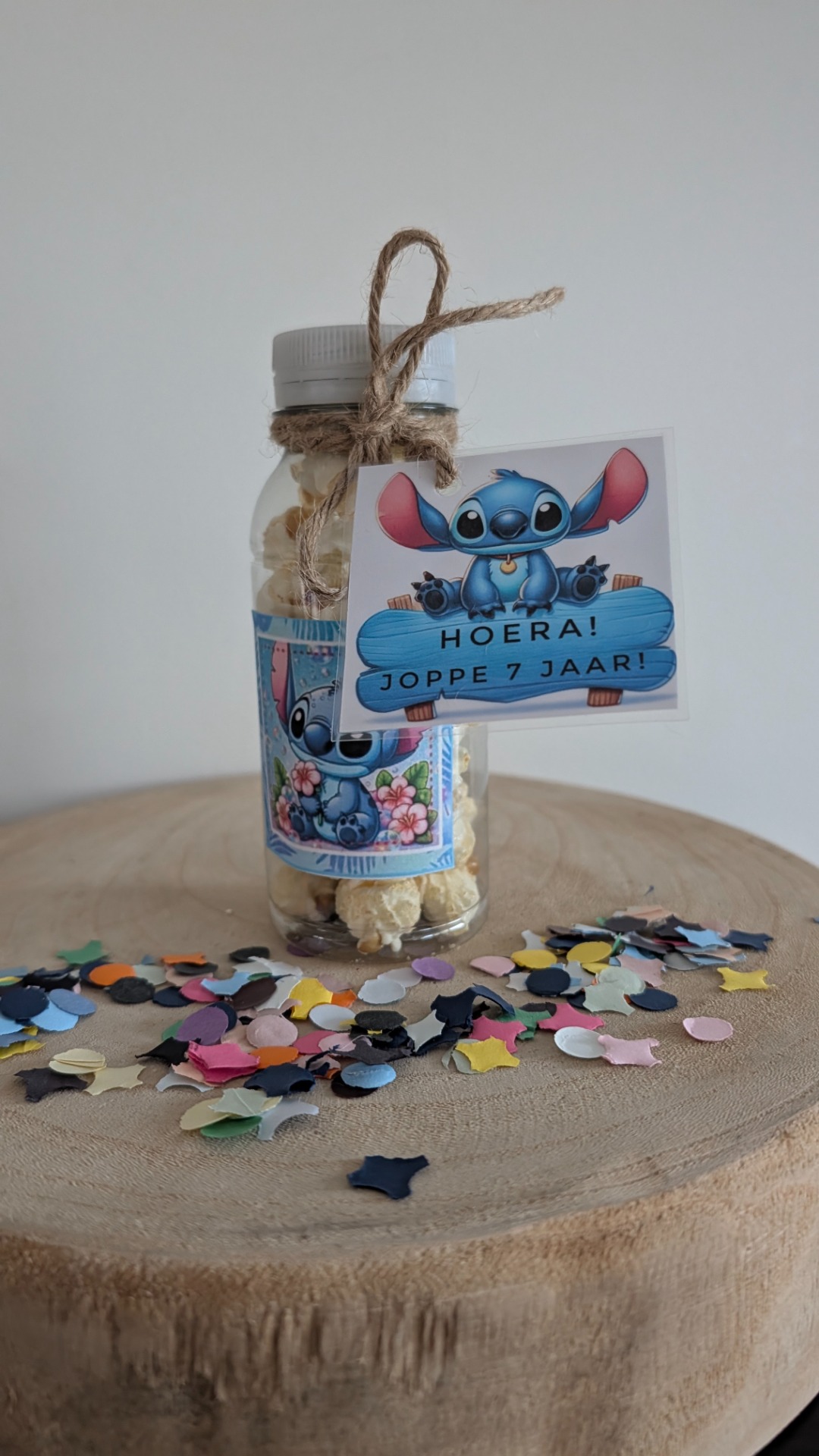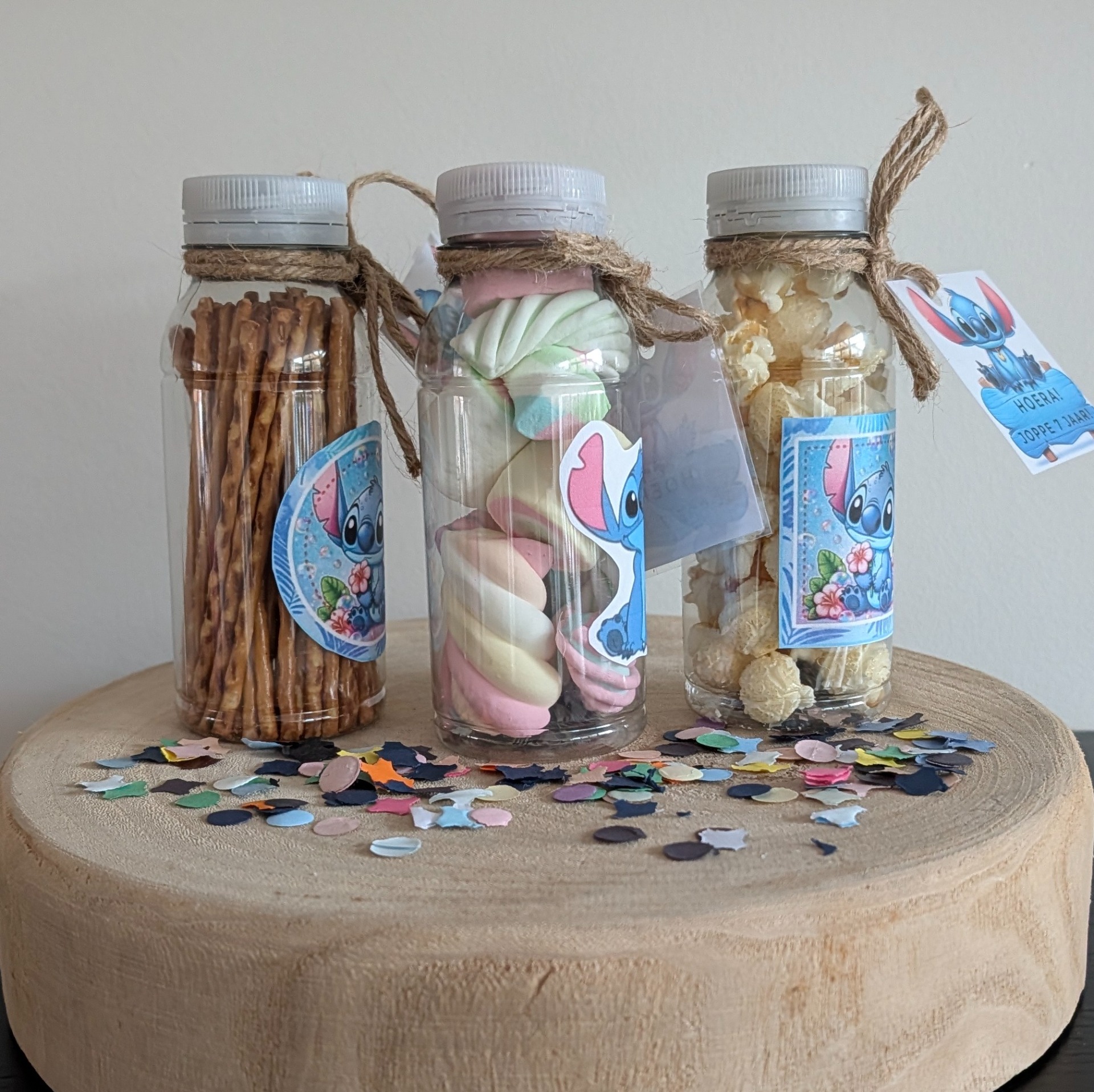 Een petflesje van 250 ml gevuld met zoute stokjes, zoete popcorn of spekjes. Kies je etiket en geef de naam en leeftijd door van de jarige aan het eind van je bestelling bij "extra informatie"