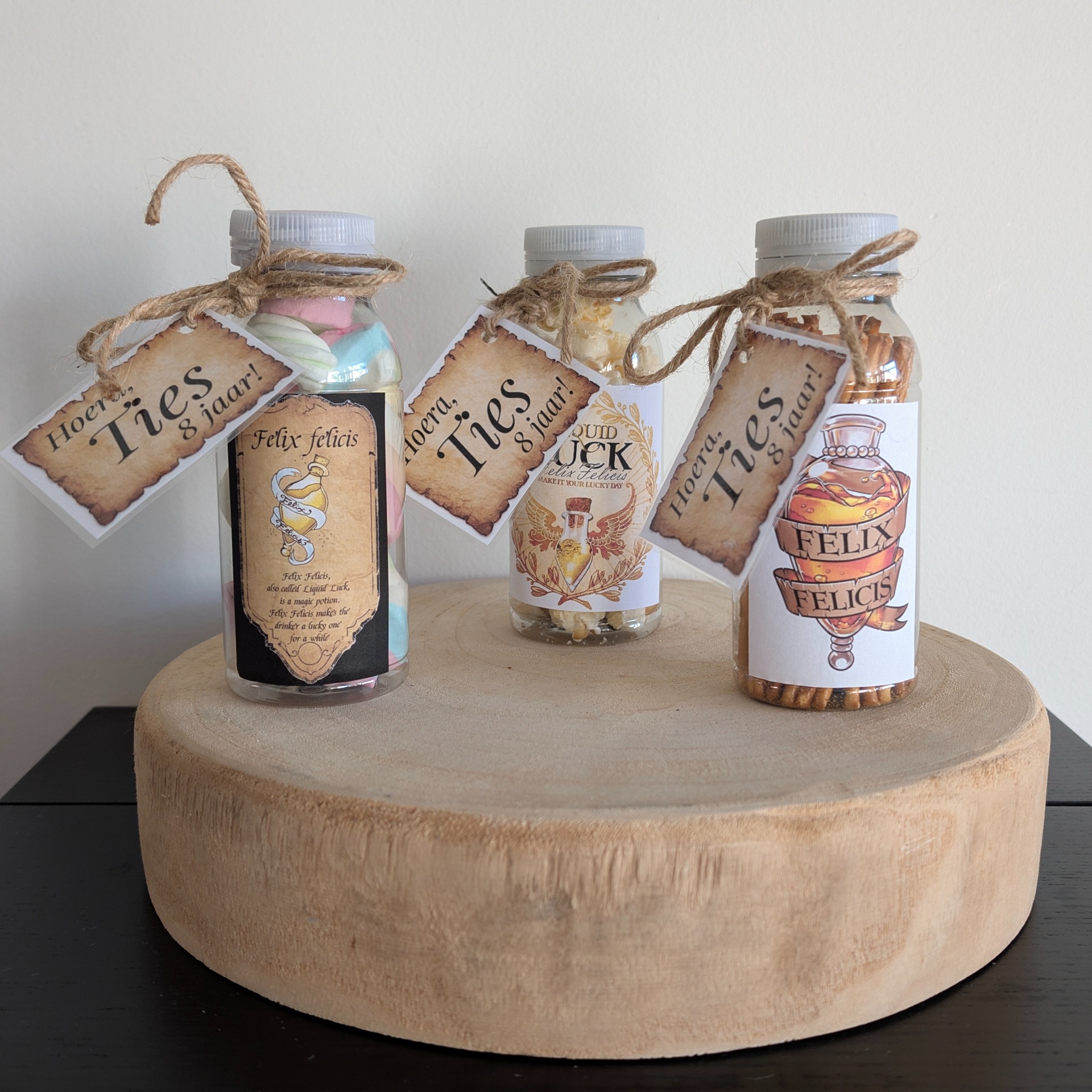 Geluksdrank van Harry Potter. Kies de inhoud van het flesje en geef de naam van fe jarige door aan het eind van de bestelling bij extra informatie.