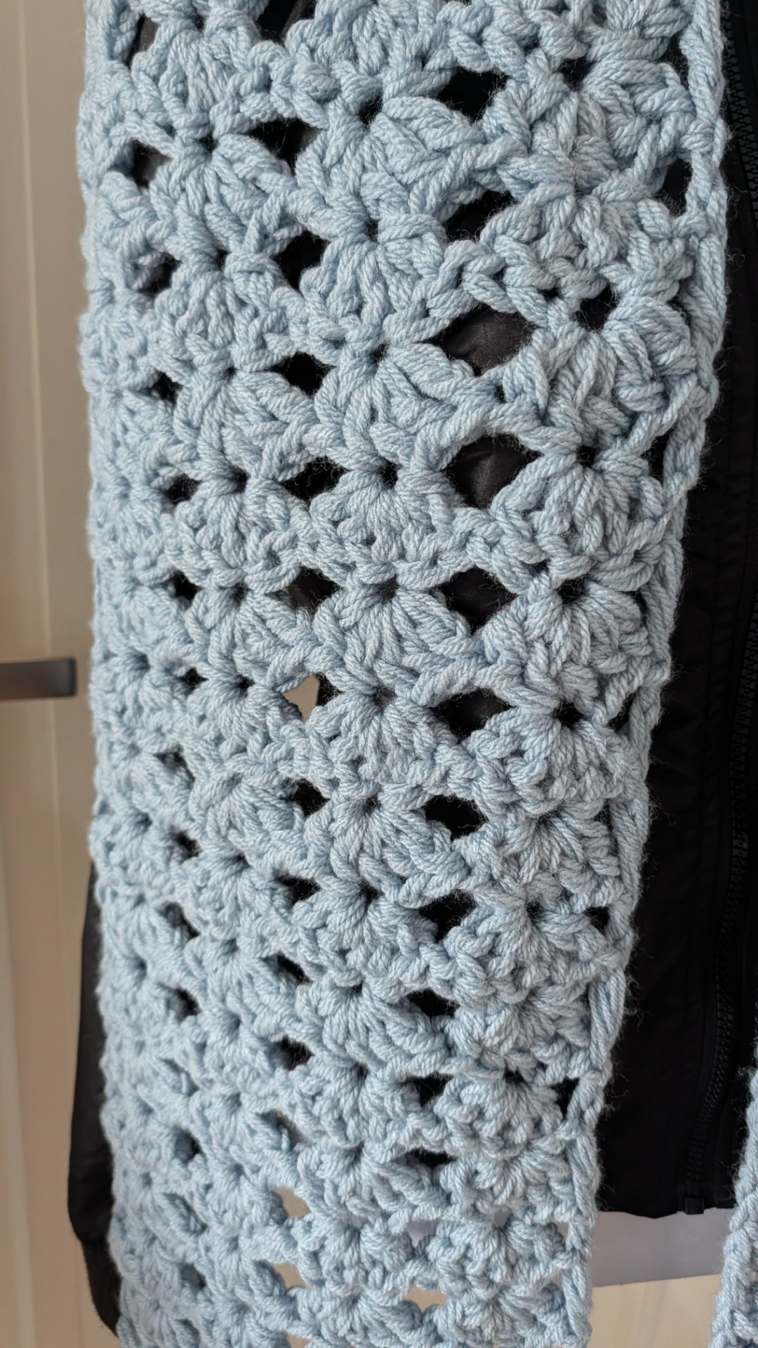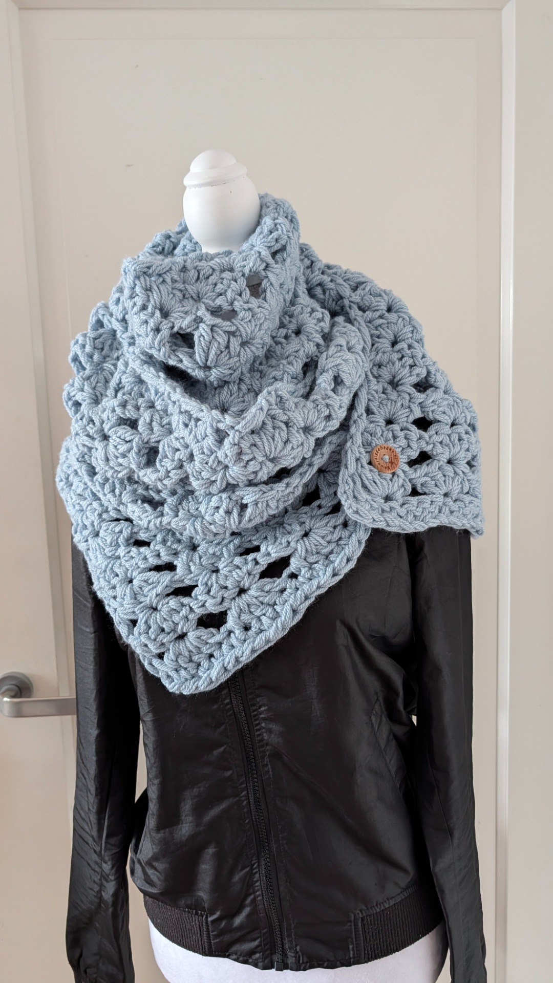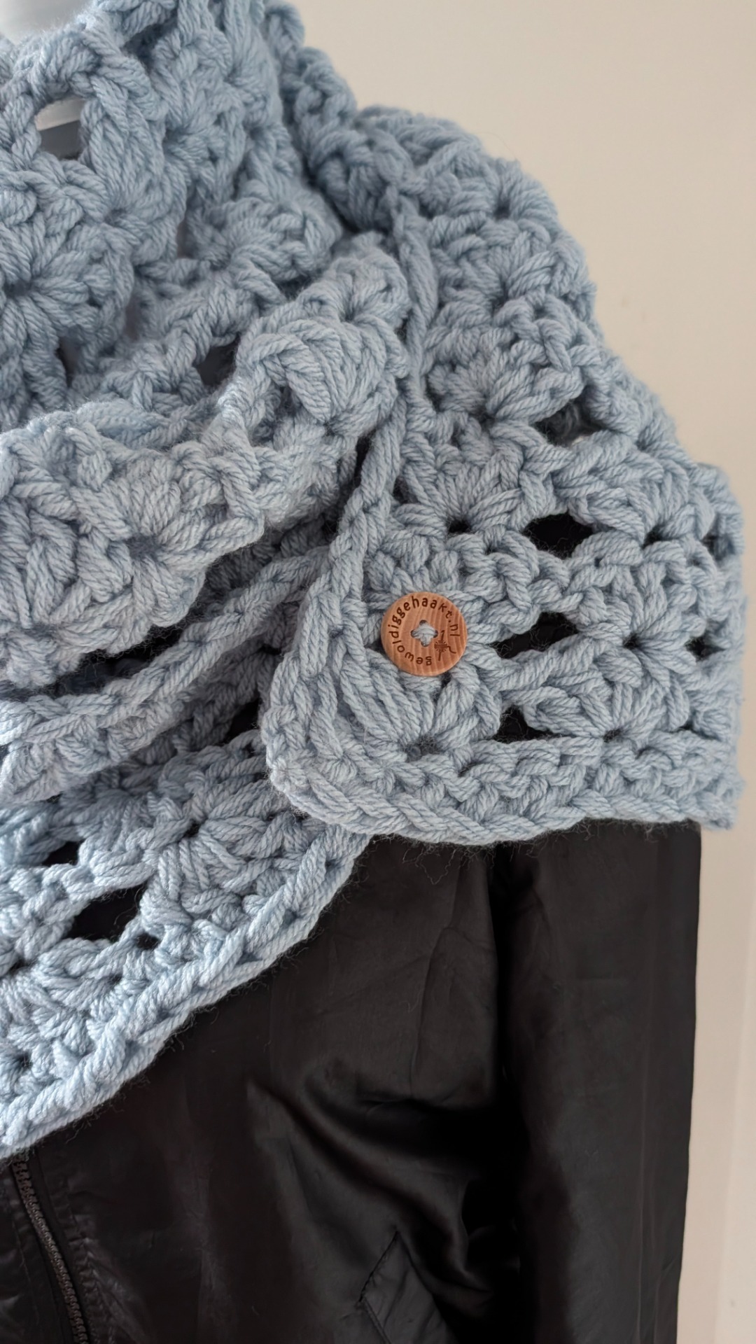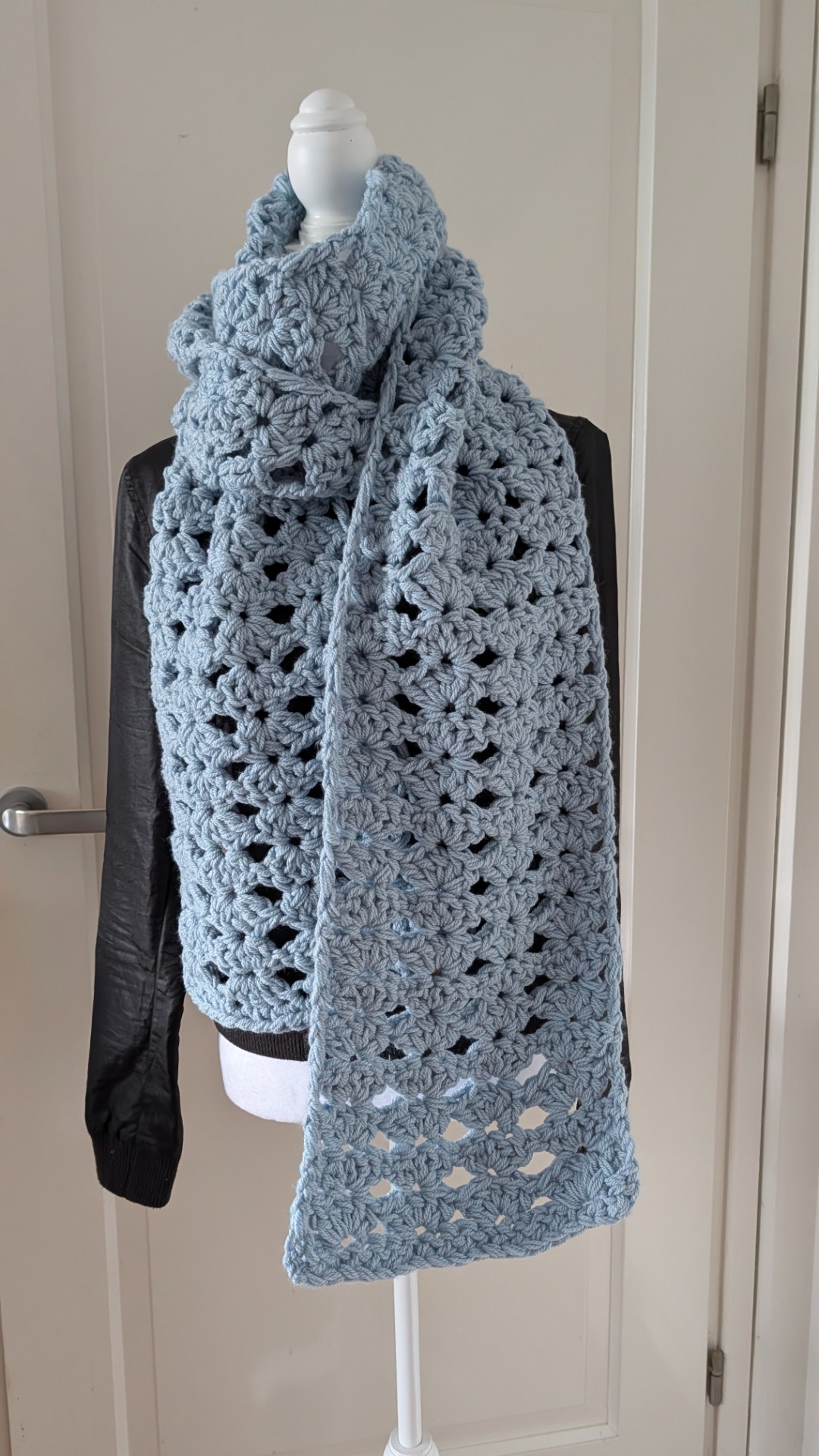 Deze sjaal is 220cm lang en heeft een mooie patroon. De IJsblauwe kleur is niet meer te koop, dus one of a kind!