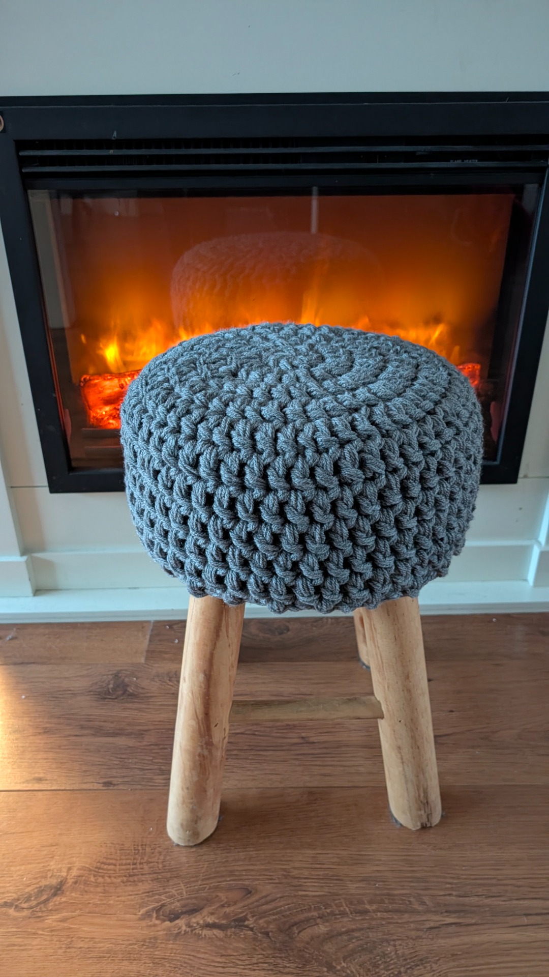 Deze krukhoes is gehaakt met vier bollen wol tegelijk en haaknaald 12 voor het chunky effect.Er zit een koord door de onderste rij zodat je hem goed vast kunt maken om de kruk.