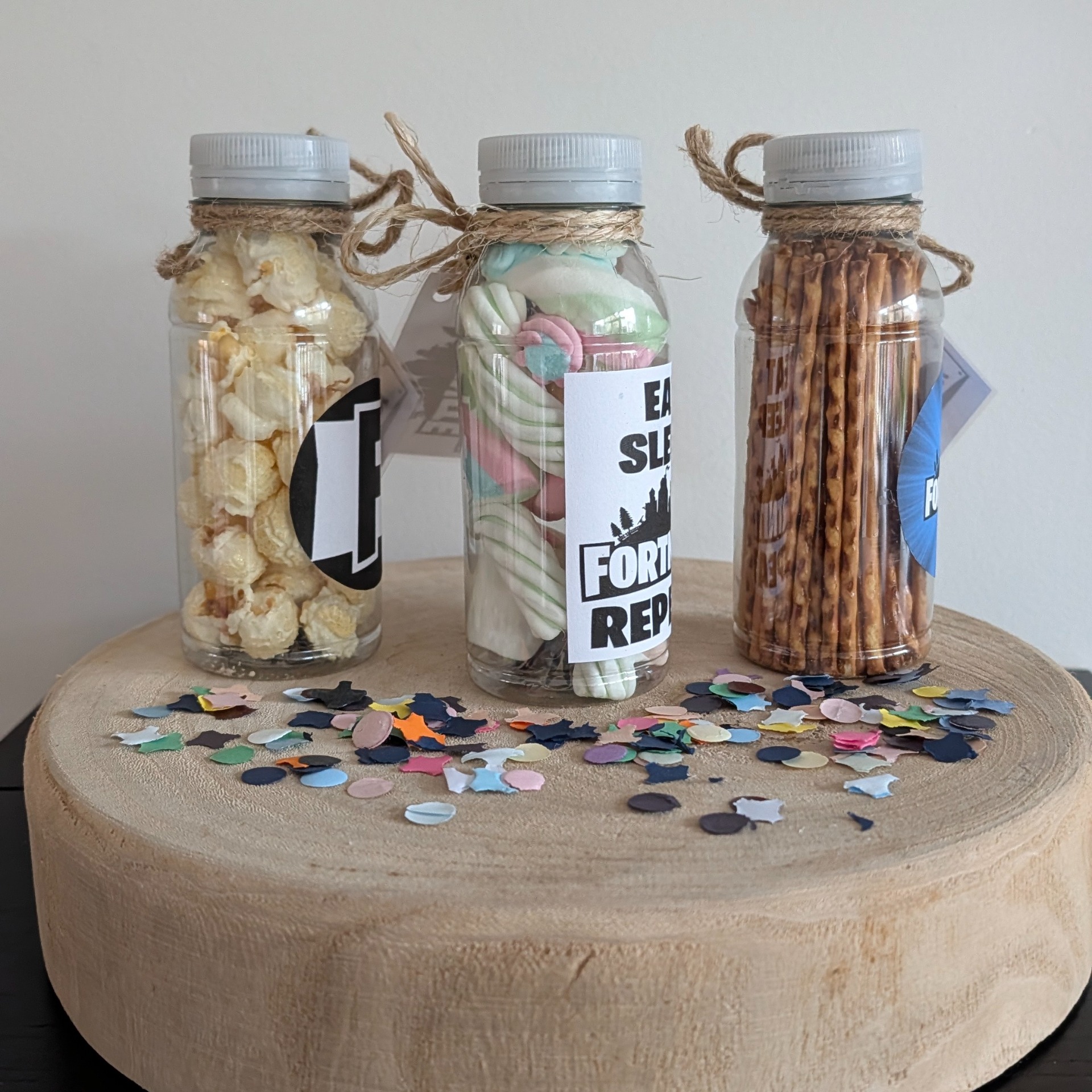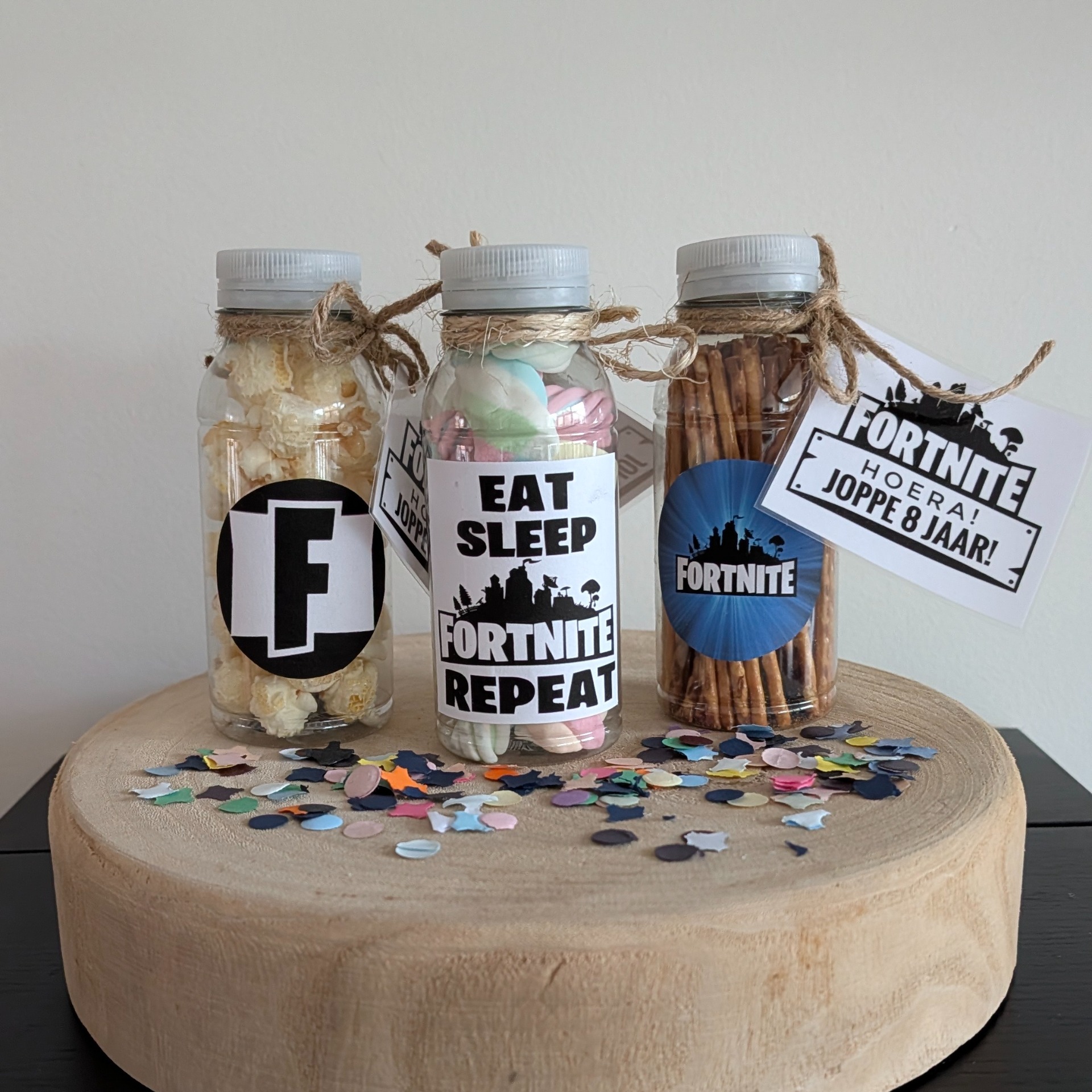 Een petflesje van 250 ml gevuld met zoute stokjes, zoete popcorn of spekjes. Kies je etiket en geef de naam en leeftijd door van de jarige aan het eind van je bestelling bij "extra informatie"