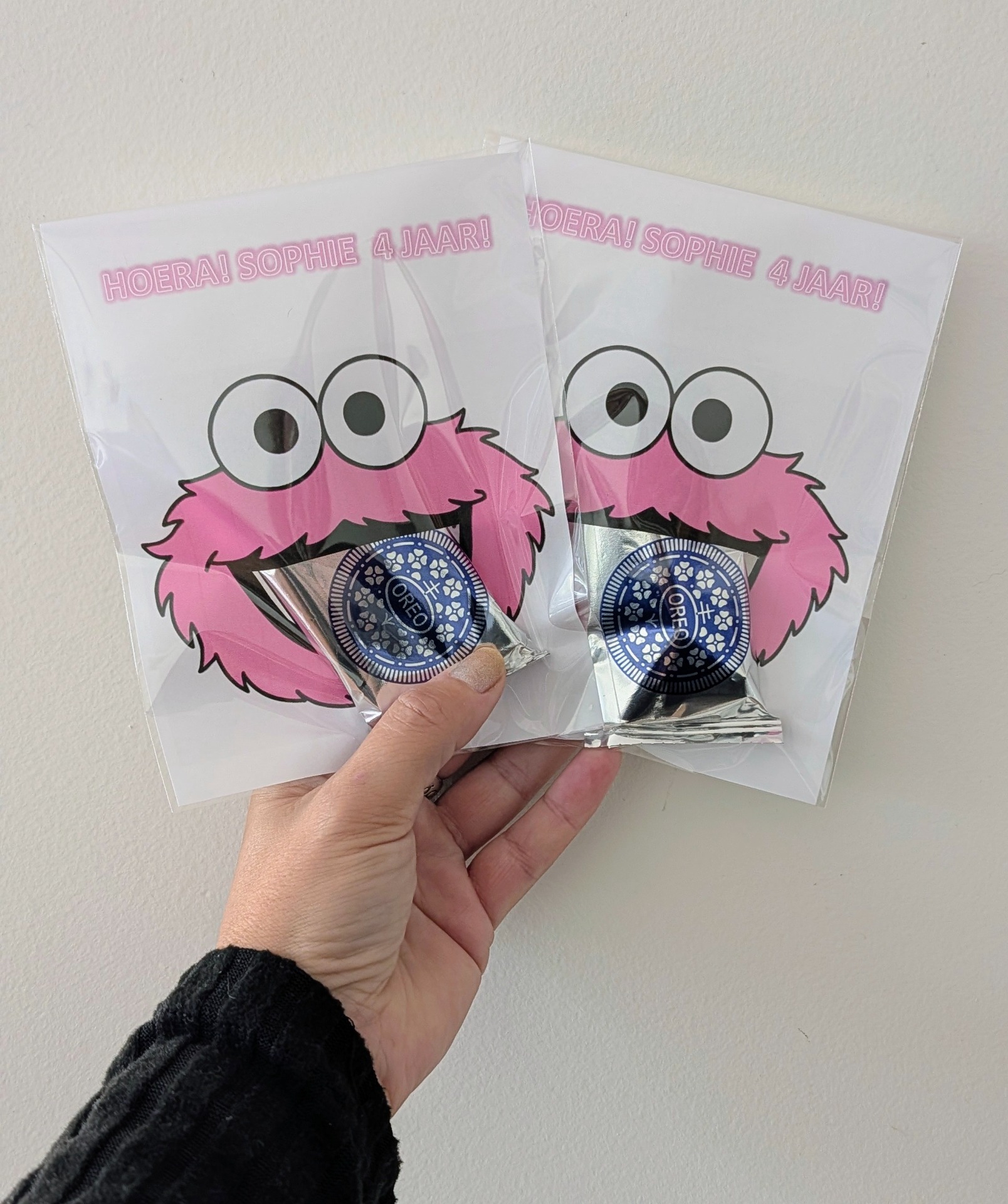 Heb je zelf geen tijd of inspiratie om een traktatie te maken? Hoe leuk is roze koekiemonster met een pakje oreo koekjes. De naam en leeftijd van de jarige kun je doorgeven aan het eind van de bestelling bij extra informatie.
